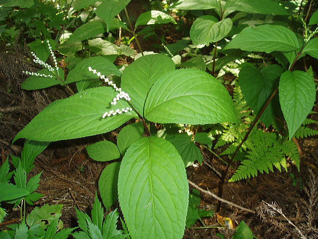 フタリシズカの茎や葉が若い時、茎上に穂状花序をつくり、白色のこまかい花をつくります。花穂はふつう2個で、希に3〜4個つけることがあります。